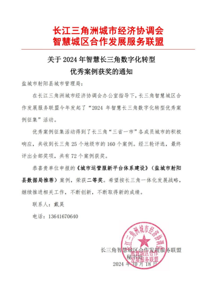在长三角智慧城区合作发展服务联盟今年发起的2024 年智慧长三角数字化转型优秀案例征集大赛中,射阳县城市管理局申报的《城市运管服新平台体系建设》案例,成功摘得二等奖殊荣。