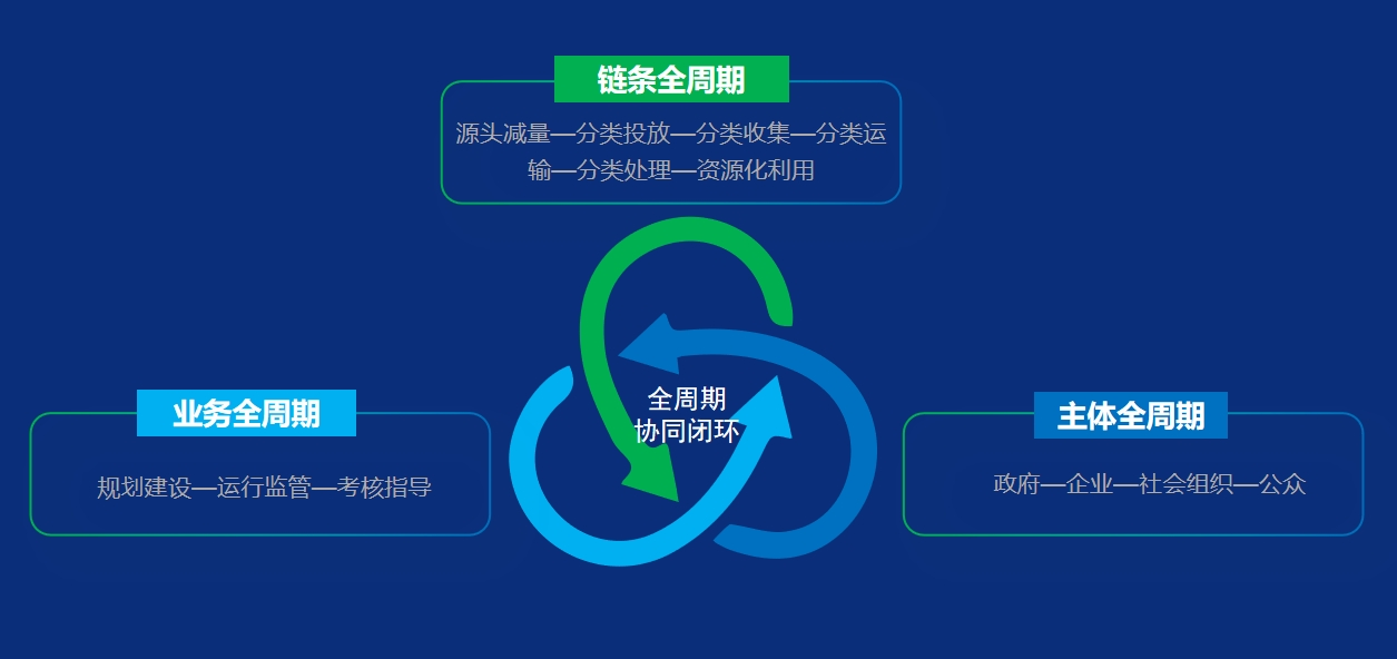 链条全周期:实现垃圾从源头分类投放、清扫保洁、分类收集、分类运输、末端处理到资源利用的环卫业务全链条监管;