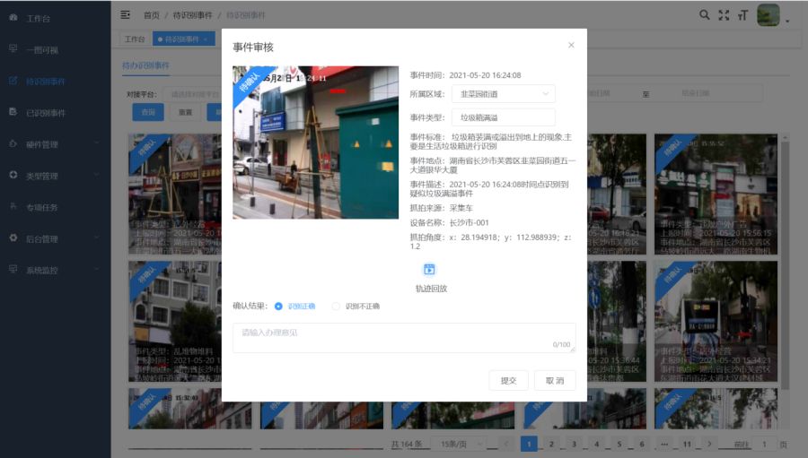 基于科技化办公需要,图元建立了事件识别审核系统,系统接收各类视频分析的事件结果,并以表格的信息展现所有的事情情况。事件审核人员可以通过行业类别、事件类型、所属区域、案发时间查询相关的事件,同时基于自动分析结果进行人工审核,对于符合立案条件的事件进行确认标识,对于不符合立案的条件进行作废标识,对于重复事件进行重复标识,并将标识结果推送给识别平台,用于平台累积记忆,深度学习。