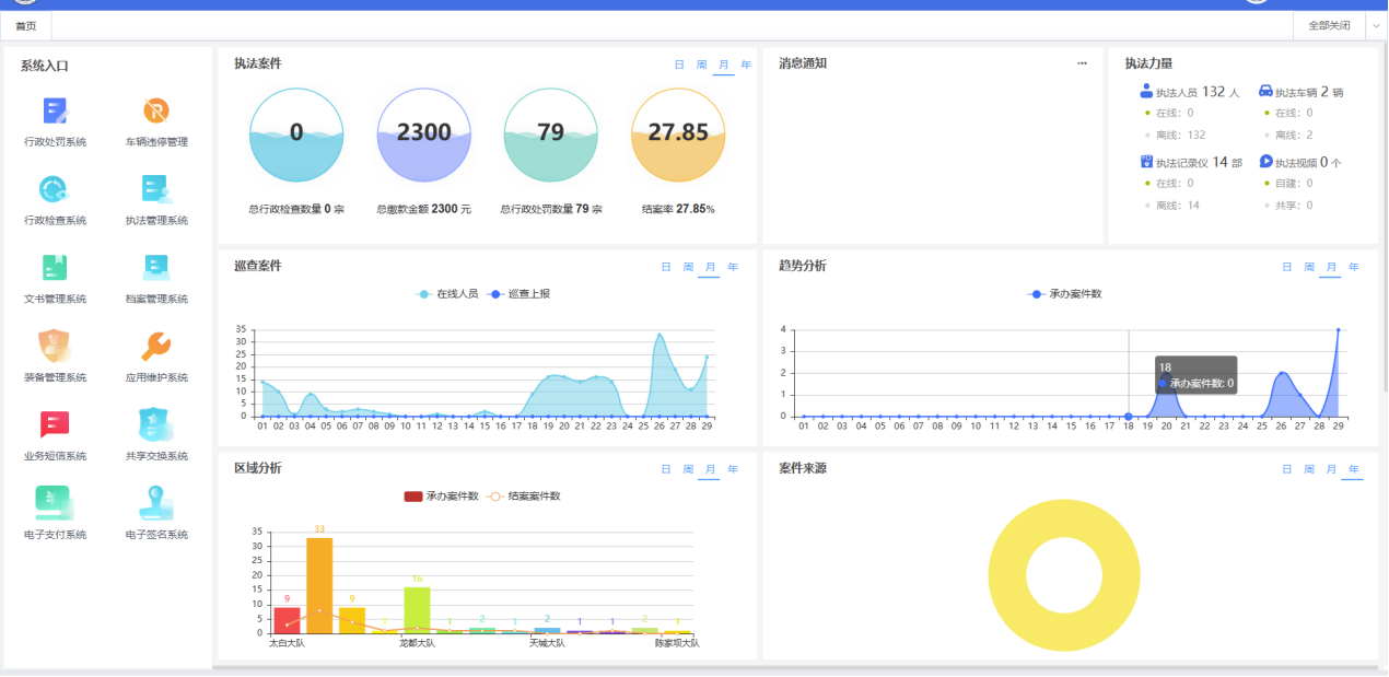 建设统一的综合执法工作平台,实现大屏、电脑和手机终端三屏融合,三屏融合充分利用现有的平台和资源以执法主体用户为核心在三屏之间形成很好的资讯互补和服务统一,从而推动彼此的价值提升。在不同网络之间为执法者提供关联匹配的业务,使执法管理者可以随时随地的享受到多终端融合的使用服务,为用户带来三屏的持续体验。大屏侧重于执法管理、运行监控、调度指挥、数据分析与展示;电脑屏侧重于执法办案、业务处理、协同工作和数据统计;移动端则采用全移动模式,实现执法办案现场取证、案件批转、指挥调度、数据分析、督查督办等功能。