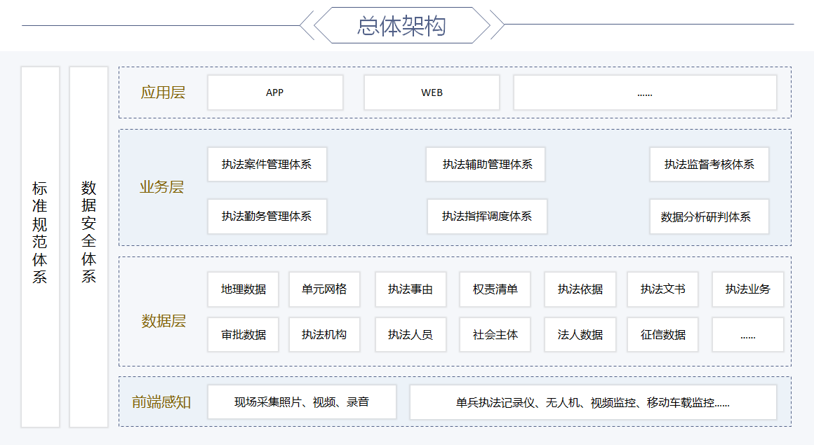 标准规范体系是数据融合、互动的基础,万州区智慧城管综合执法系统的标准体系包括标准组织体系、标准制度体系、执法规范体系、数据规范体系和安全保障体系。通过标准体系来统筹总体框架,在符合市级标准的同时,结合万州实情,构建一套具有万州特色的综合执法管理标准体系。